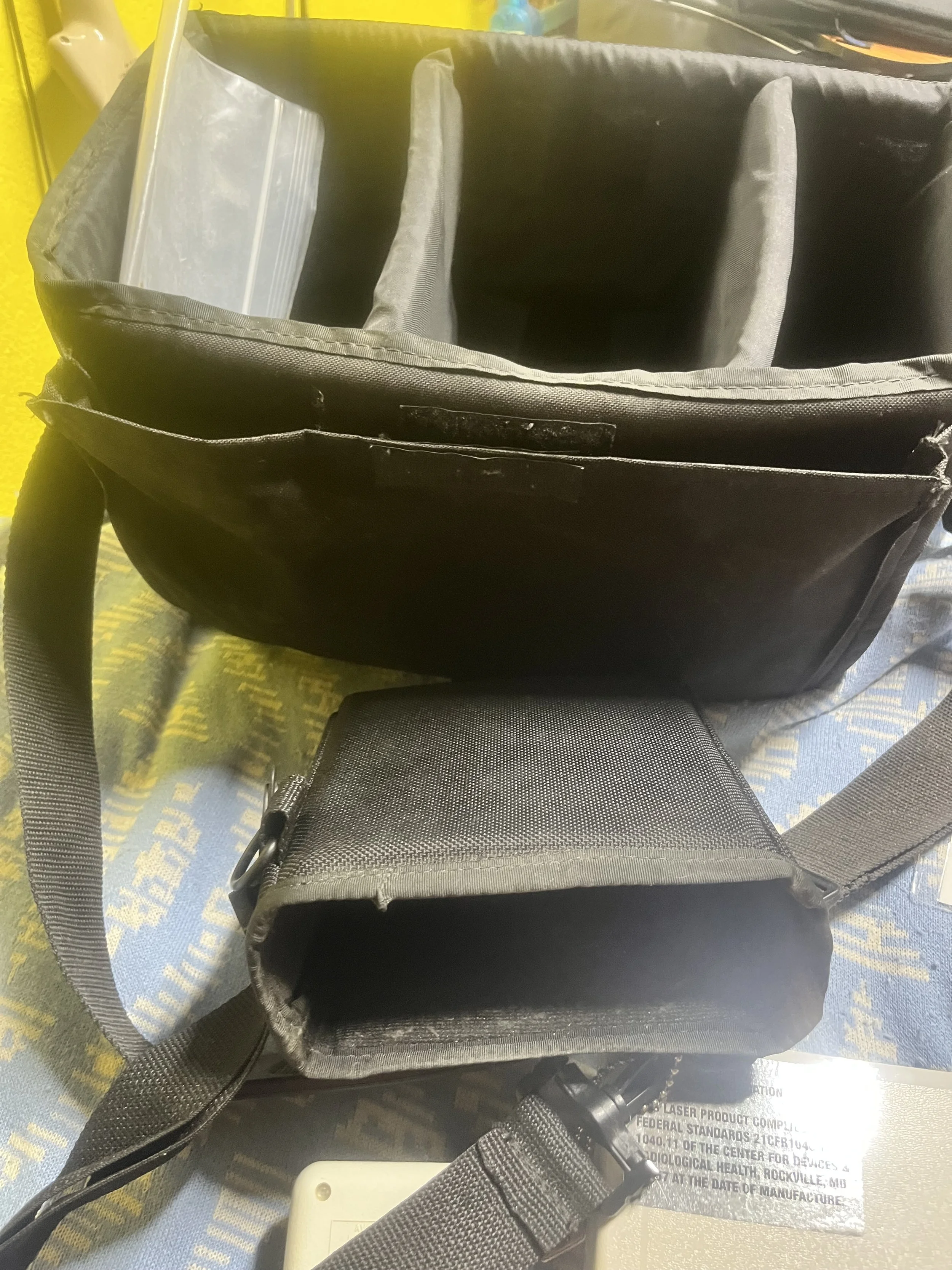 - Portable unit with black carrying case and shoulder strap