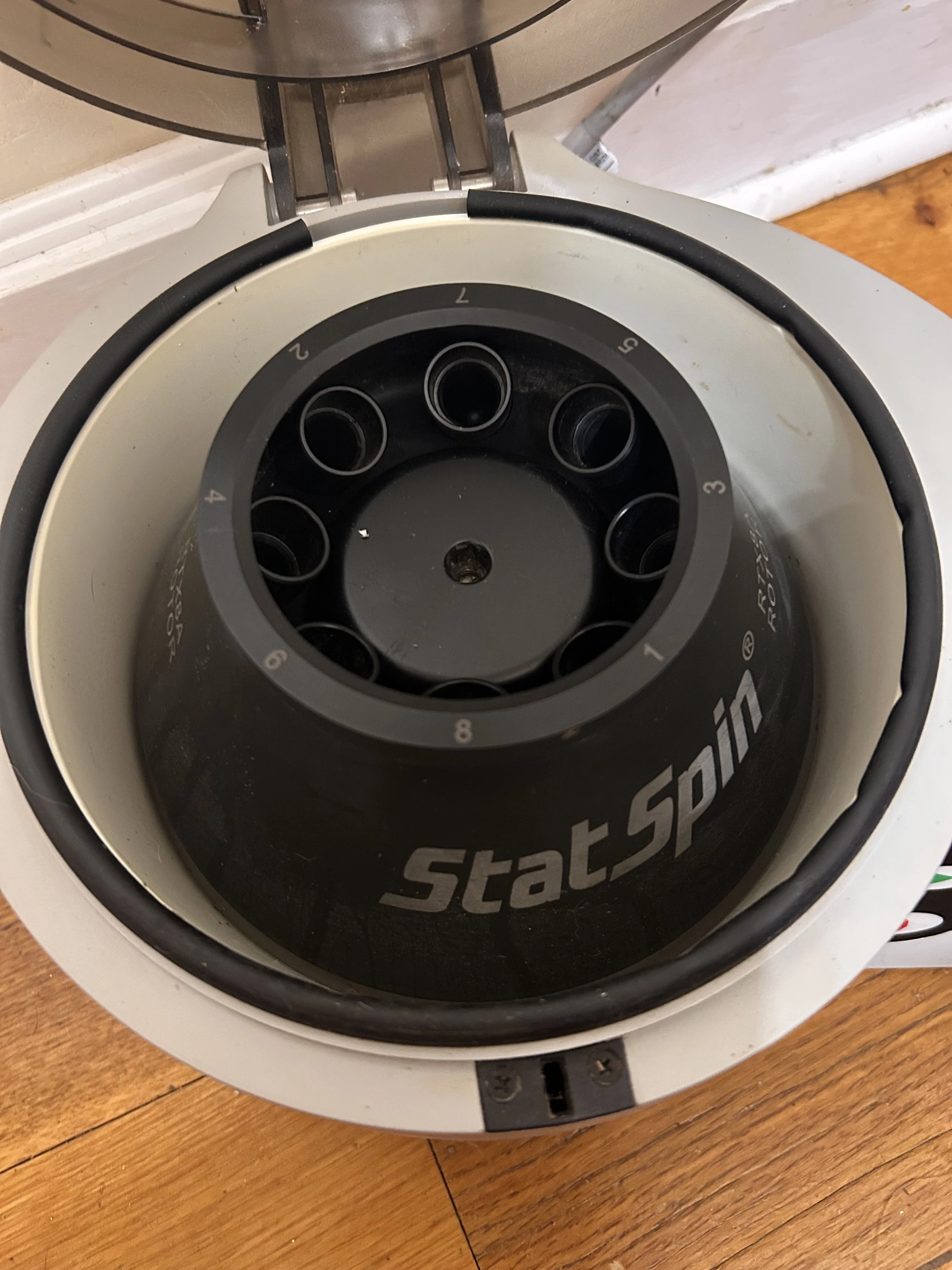 Ultra quiet and compact centrifuge with 3 time settings. Spins up to 8 samples at once. Does not include microhematocrit capabilities.
