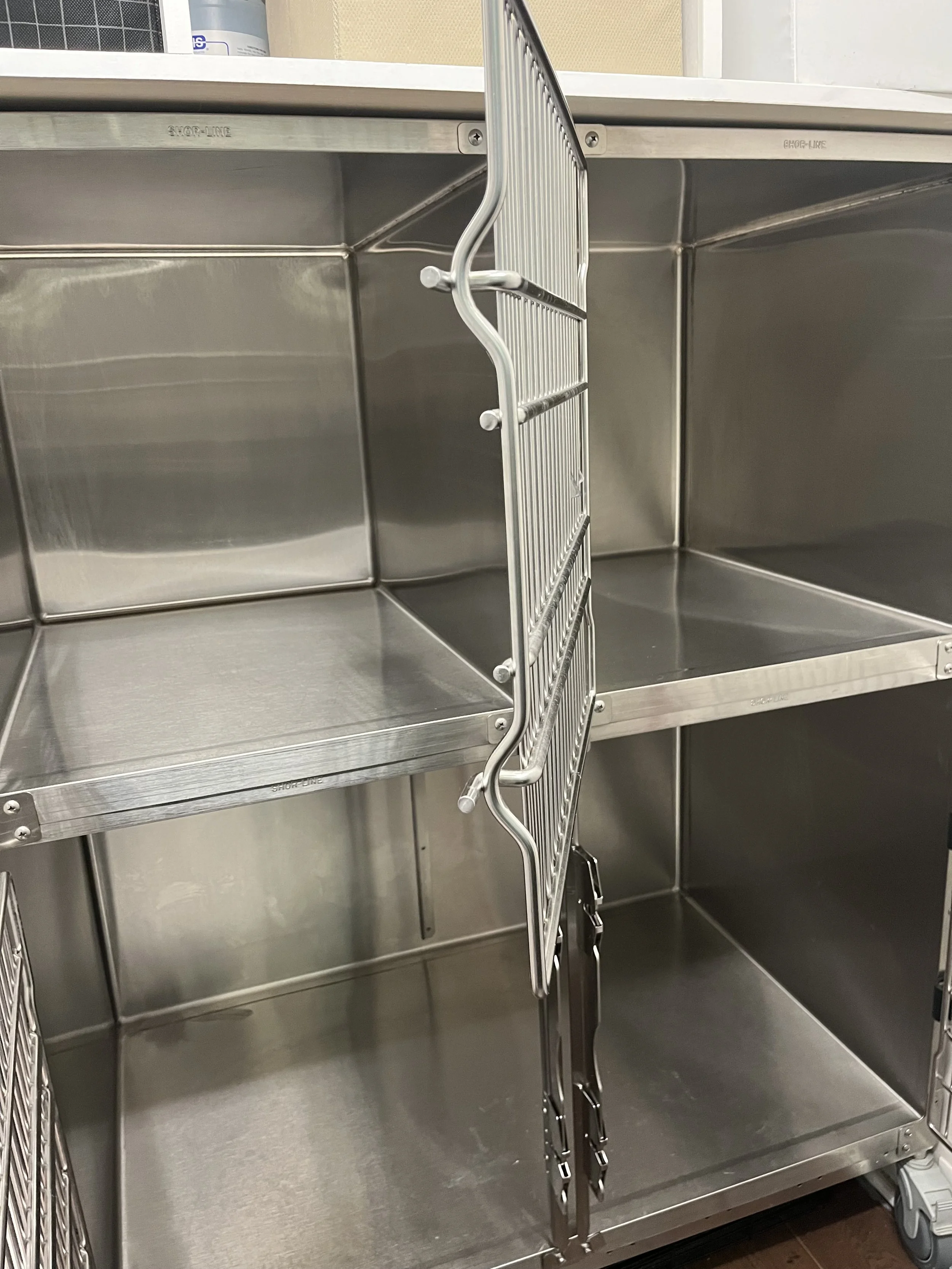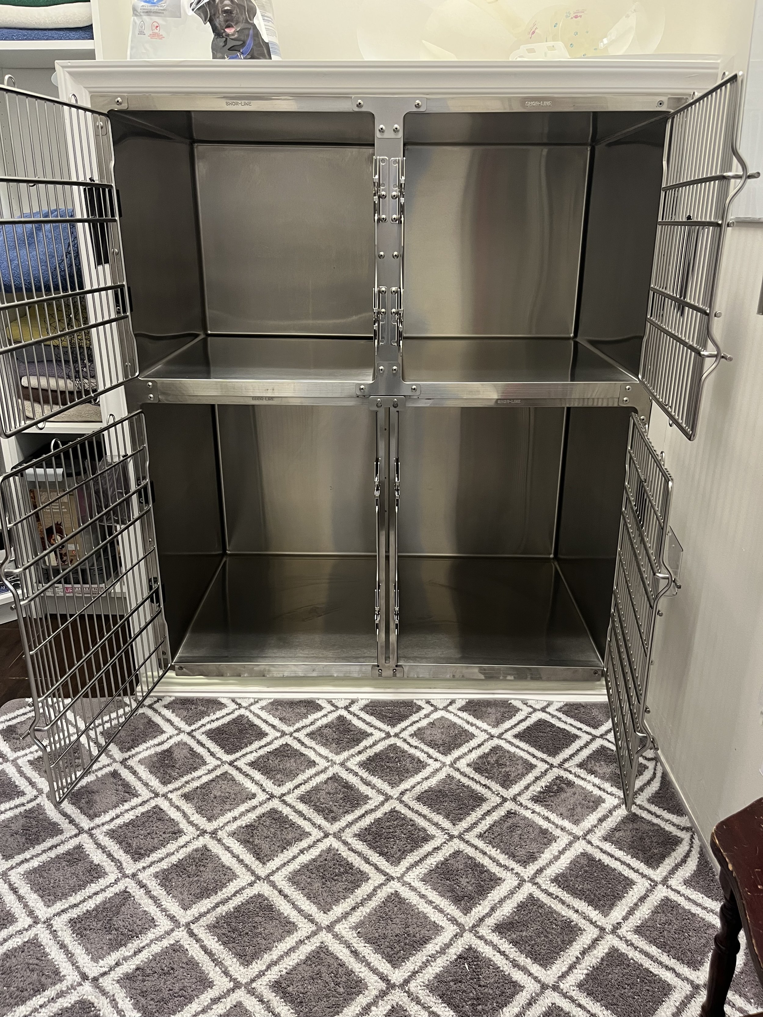 • Extra Support: We provide extra frame support below the cage floor on 60”W and 72”W double door cages for supporting larger dogs. • Cage Body: Crafted from 22-gauge, Type 304 Stainless Steel with a satin finish. Our exclusive two-piece manufacturing process minimizes the number of welded seams. Less welds means more durable, stronger and longer-lasting cages. All kennels have a front retention lip to keep fluids inside as well as sound dampening patches on all four sides to reduce noise from vibration.