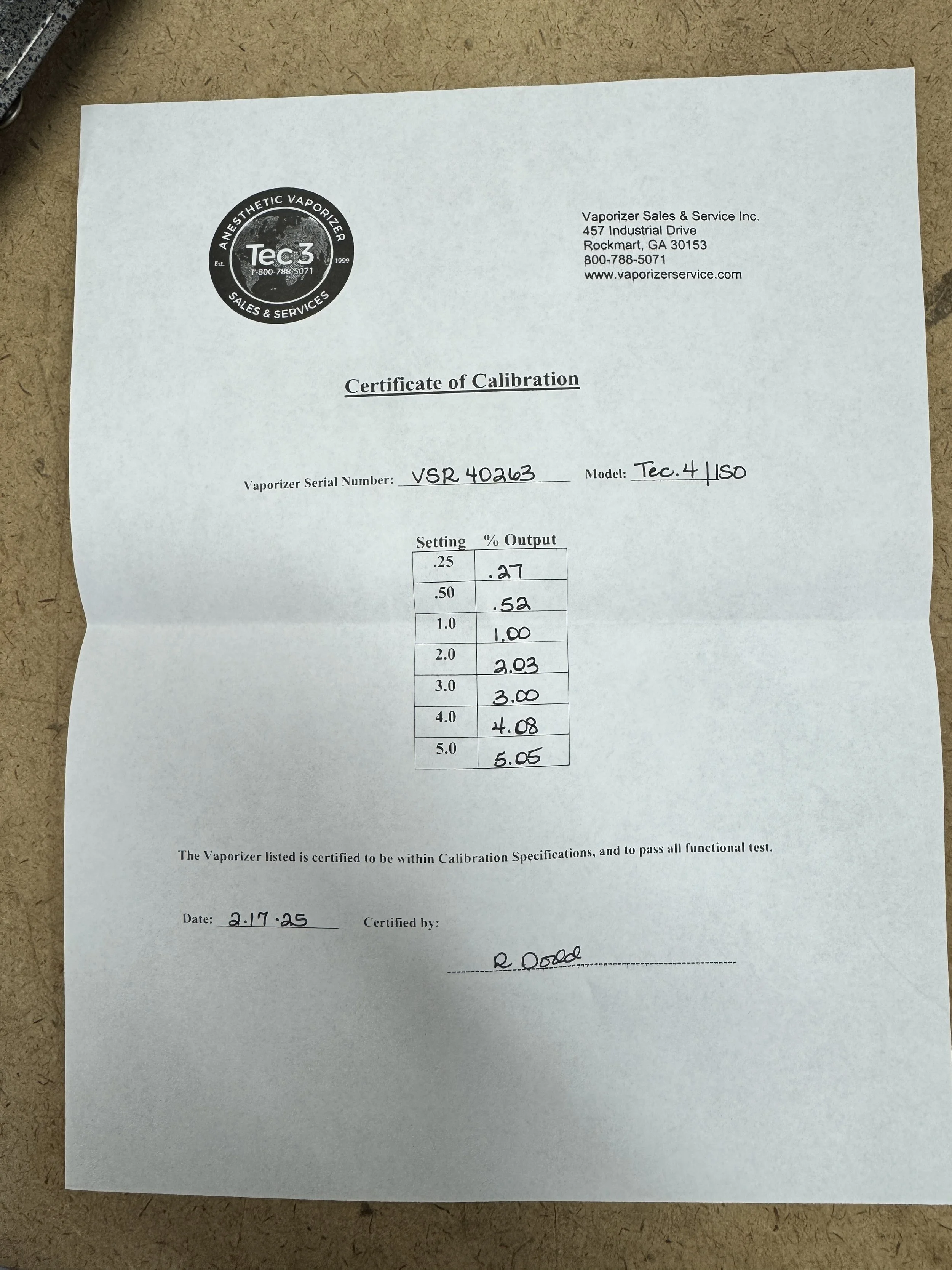 Refurbished Supera brand anesthesia machine with remanufactured TEC 4 Isoflurane (see picture of vaporizer certification from Vaporizer Sales & Service).